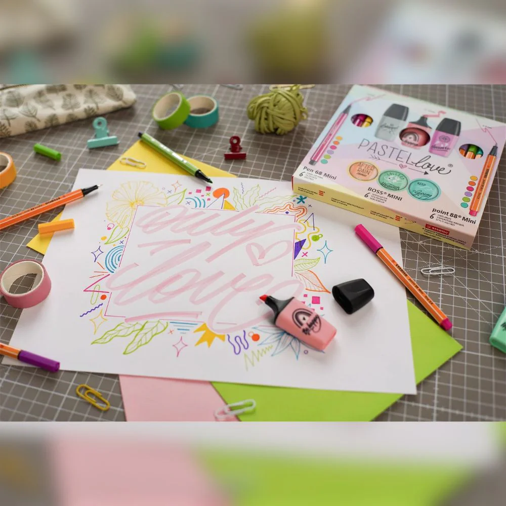 En el Kit de Destacadores y Tiralíneas Pastel Love, los minis Stabilo favoritos se reúnen en un paquete con un hermoso diseño. 6 unidades de cada uno, Boss Mini Pastel Love 2.0, Pen 68 Mini y Point 88 Mini, todos cuidadosamente surtidos en una caja de regalo.Los colores de cada pieza están perfectamente coordinados y el diseño del embalaje combina con los suaves tonos pastel. La impresión y las declaraciones positivas de Boss Mini, así como el diseño del embalaje, fueron creadas por la artista de letras, de nacionalidad alemana, Hannah Rabenstein.