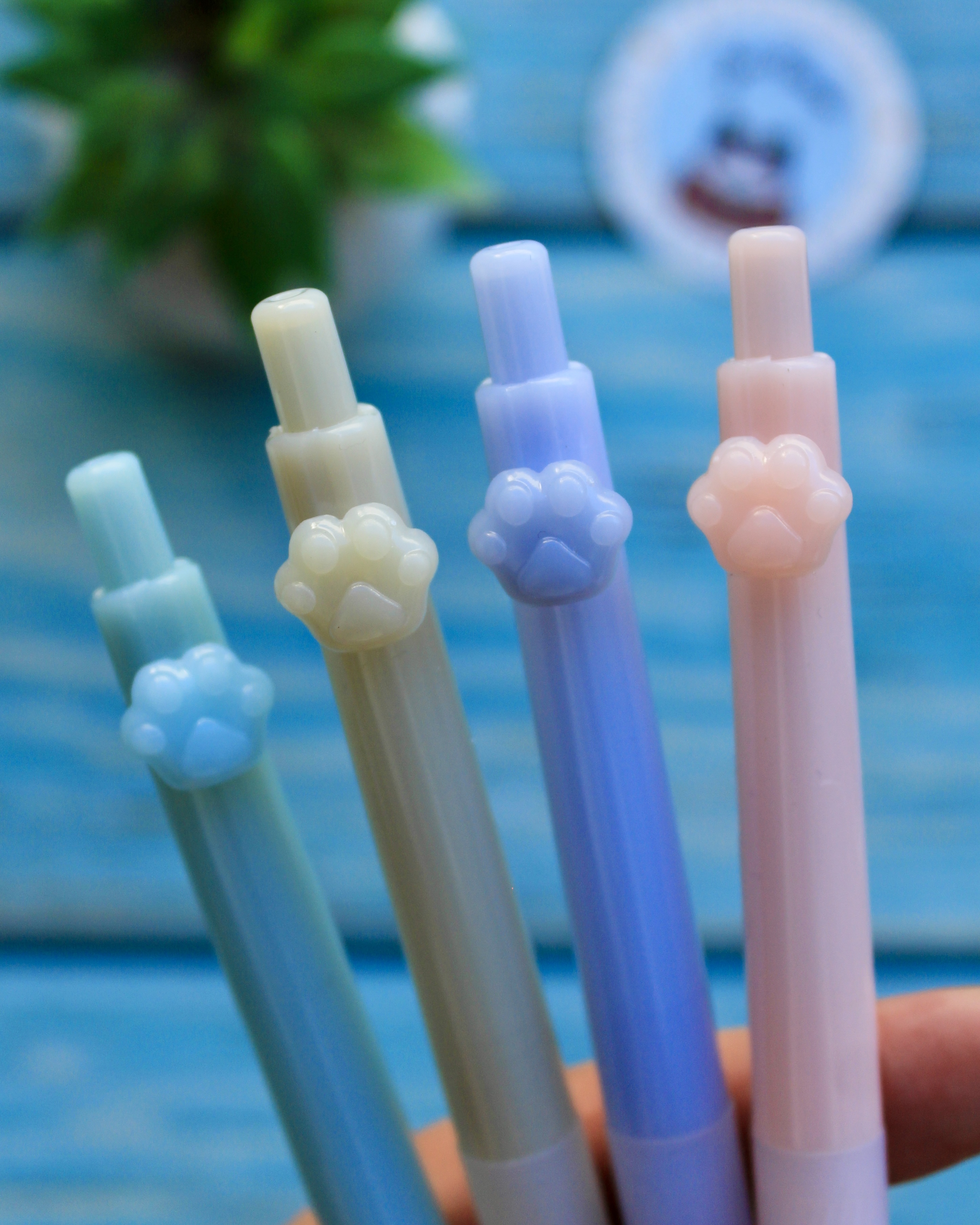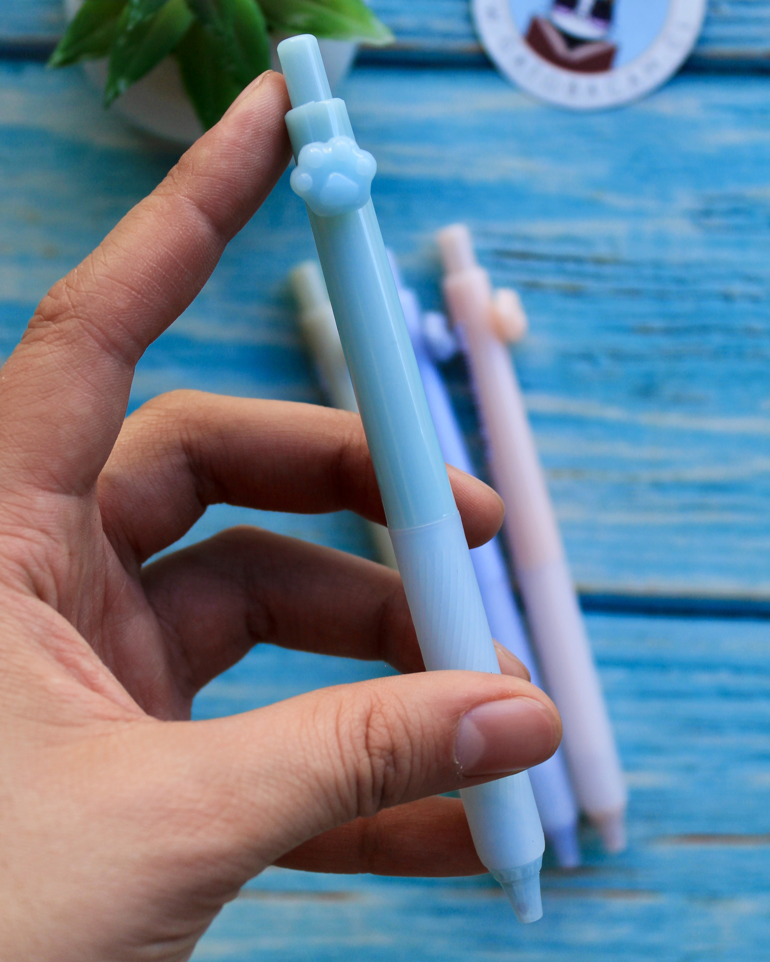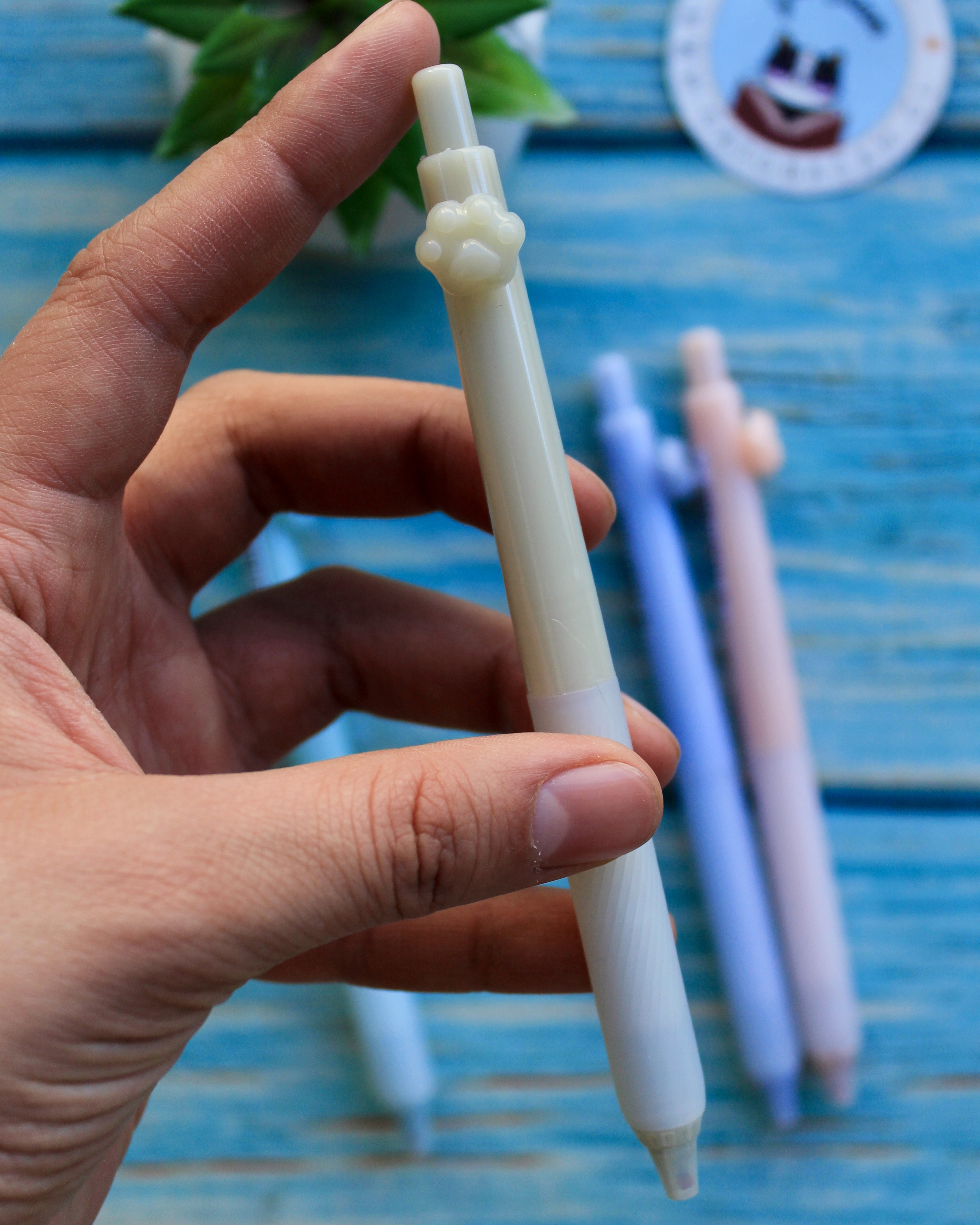 Si te gusta la escritura fina, este es el boligrafo que necesitas, tinta negra, retractil y con un grip de goma que facilita la escritura en un bello diseño en colores pasteles y patita de gato