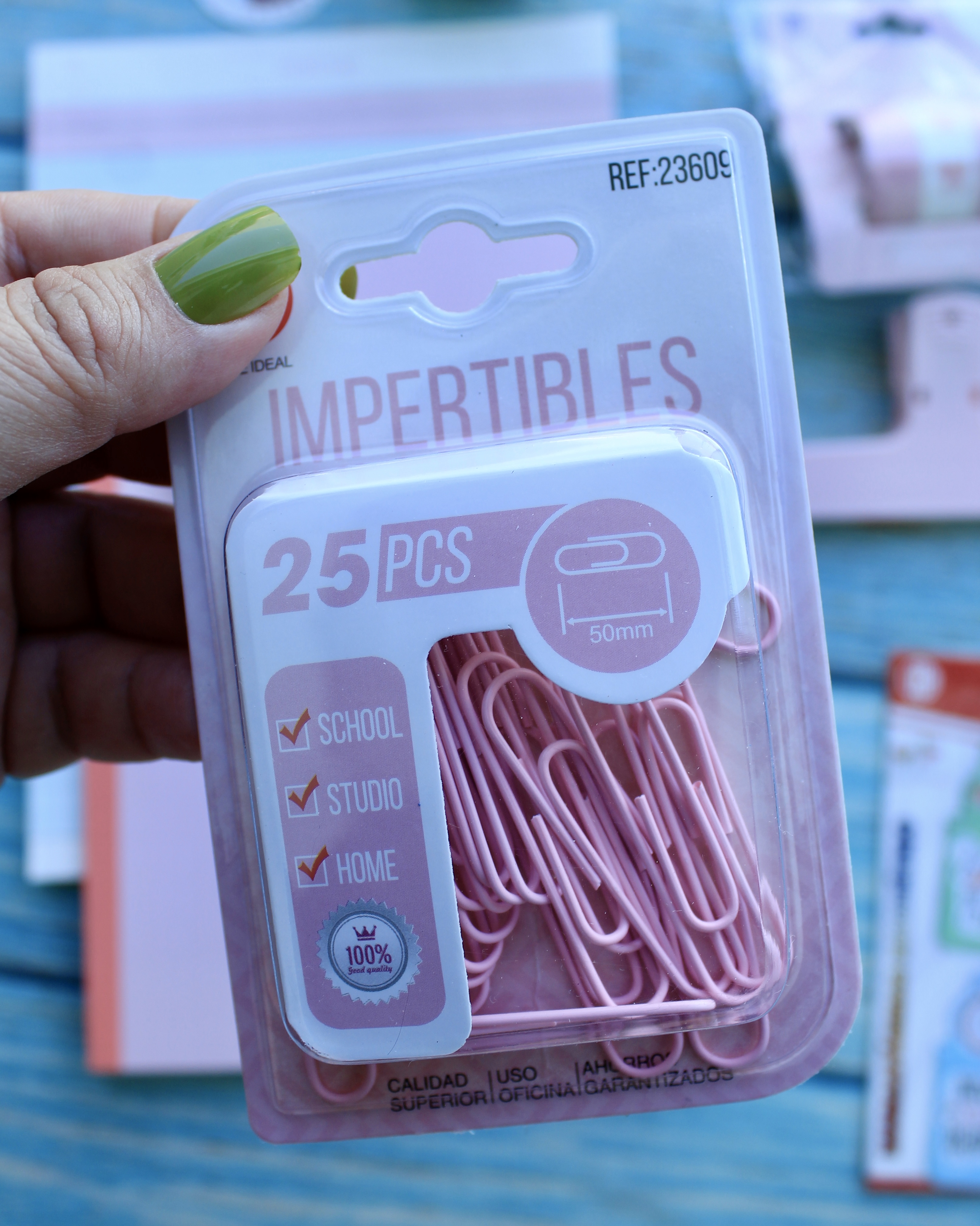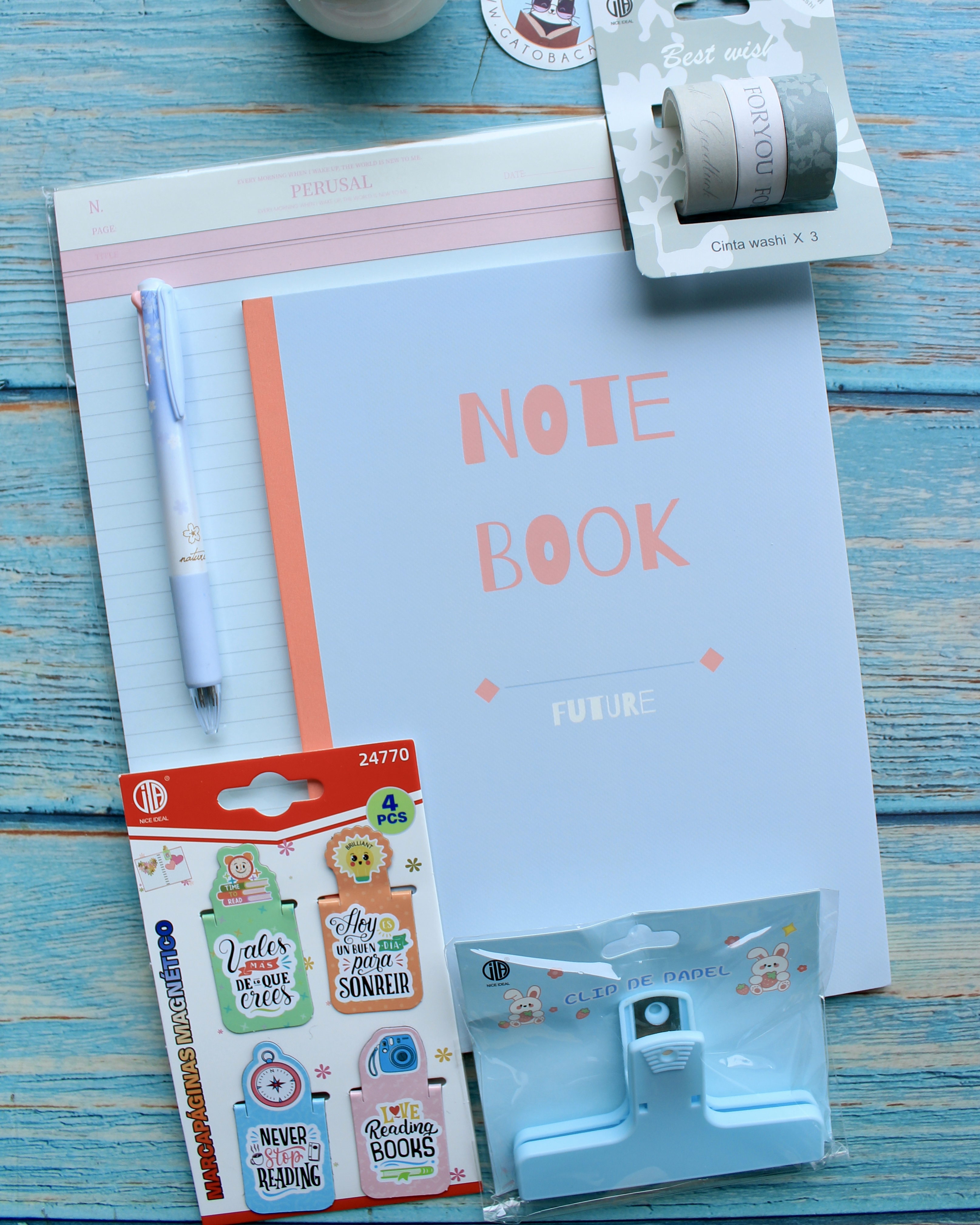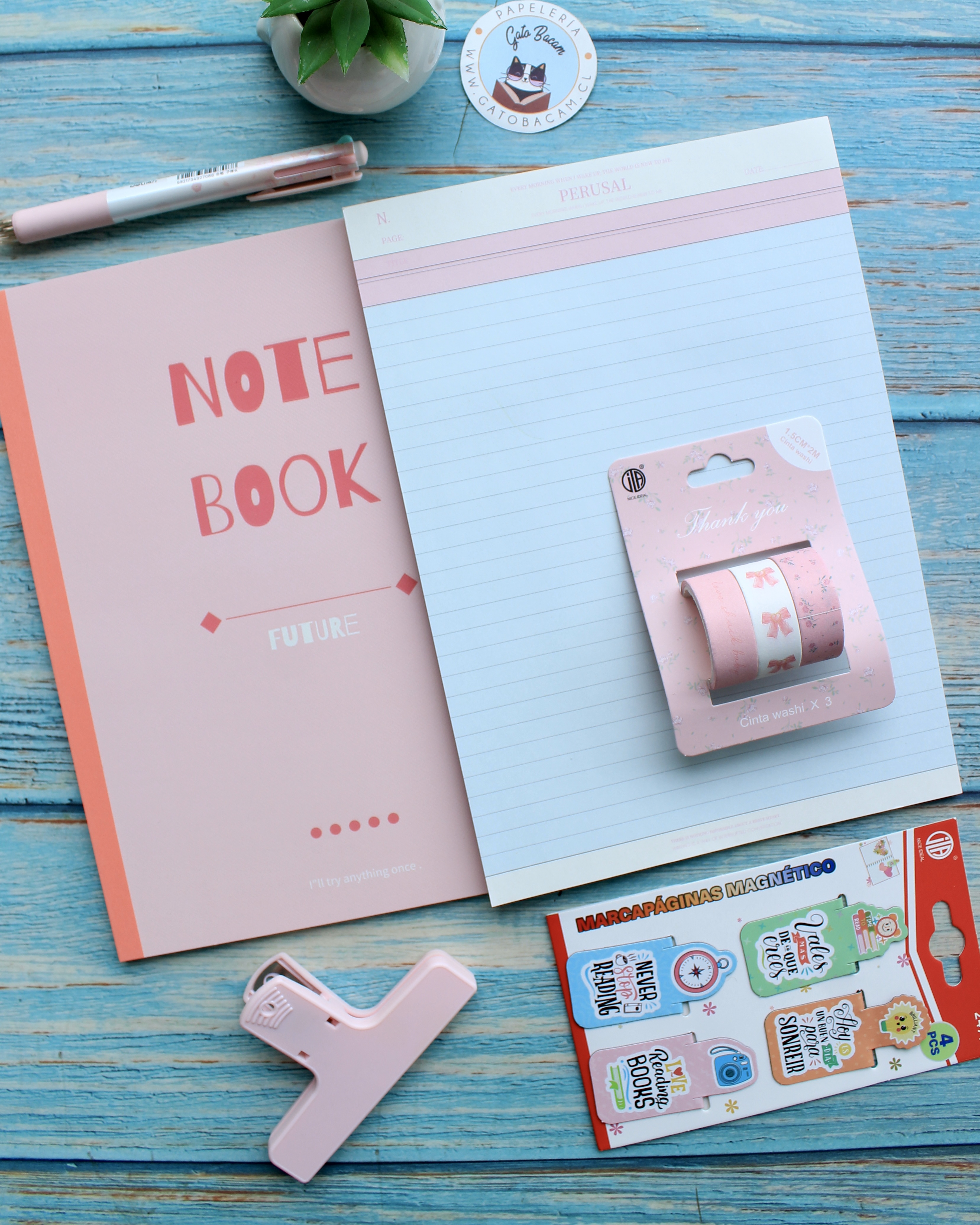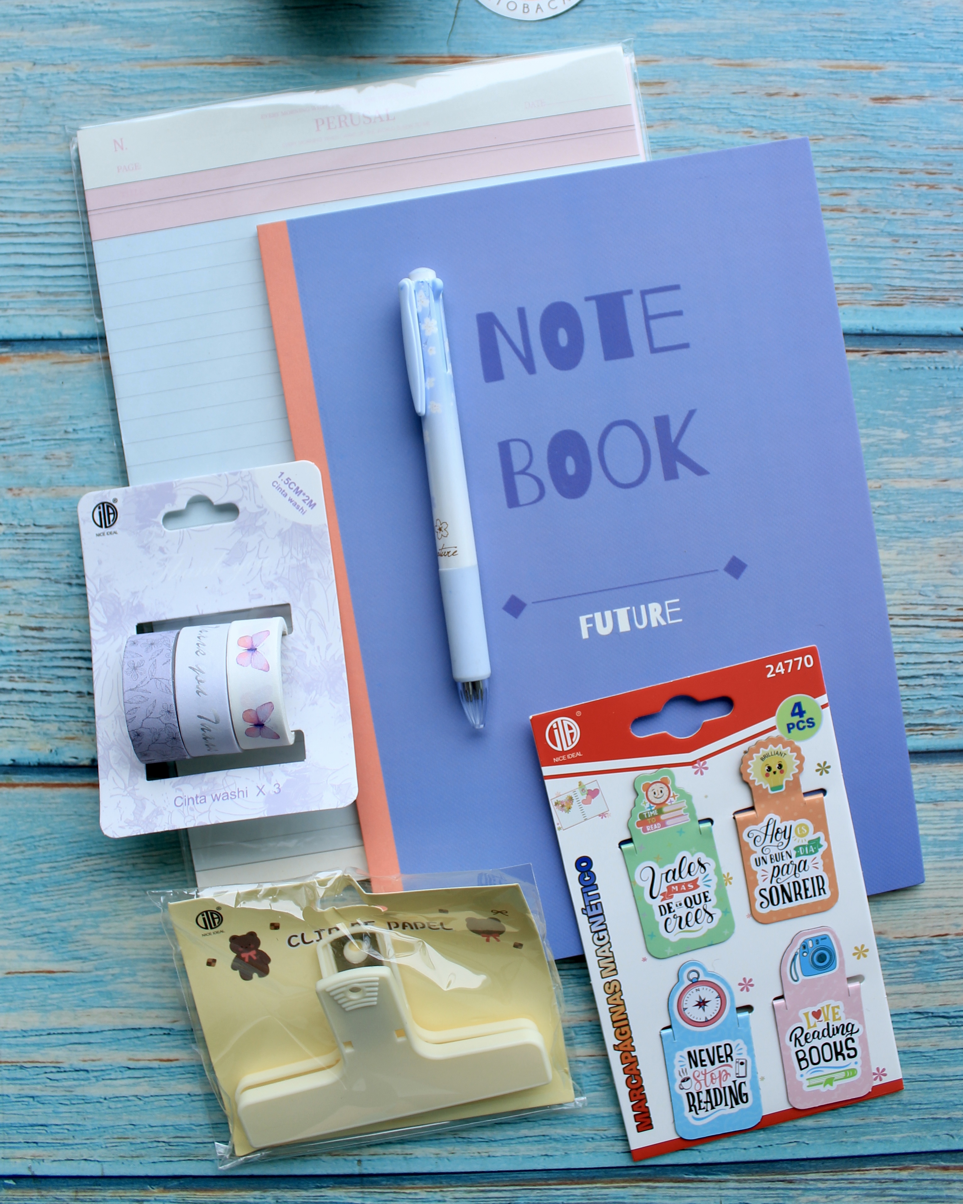 El kit también incluye un lápiz de pasta multicolor, ideal para dar vida y color a tus apuntes. No te preocupes por el desorden, ya que las pinzas agarra papeles y el set de clips te ayudarán a mantener todo en su lugar, ademas de un set de marcapaginas imantado. Por último, añade un toque personal a tus proyectos con la cinta washi tape de diseño incluido, que es versátil y decorativa.