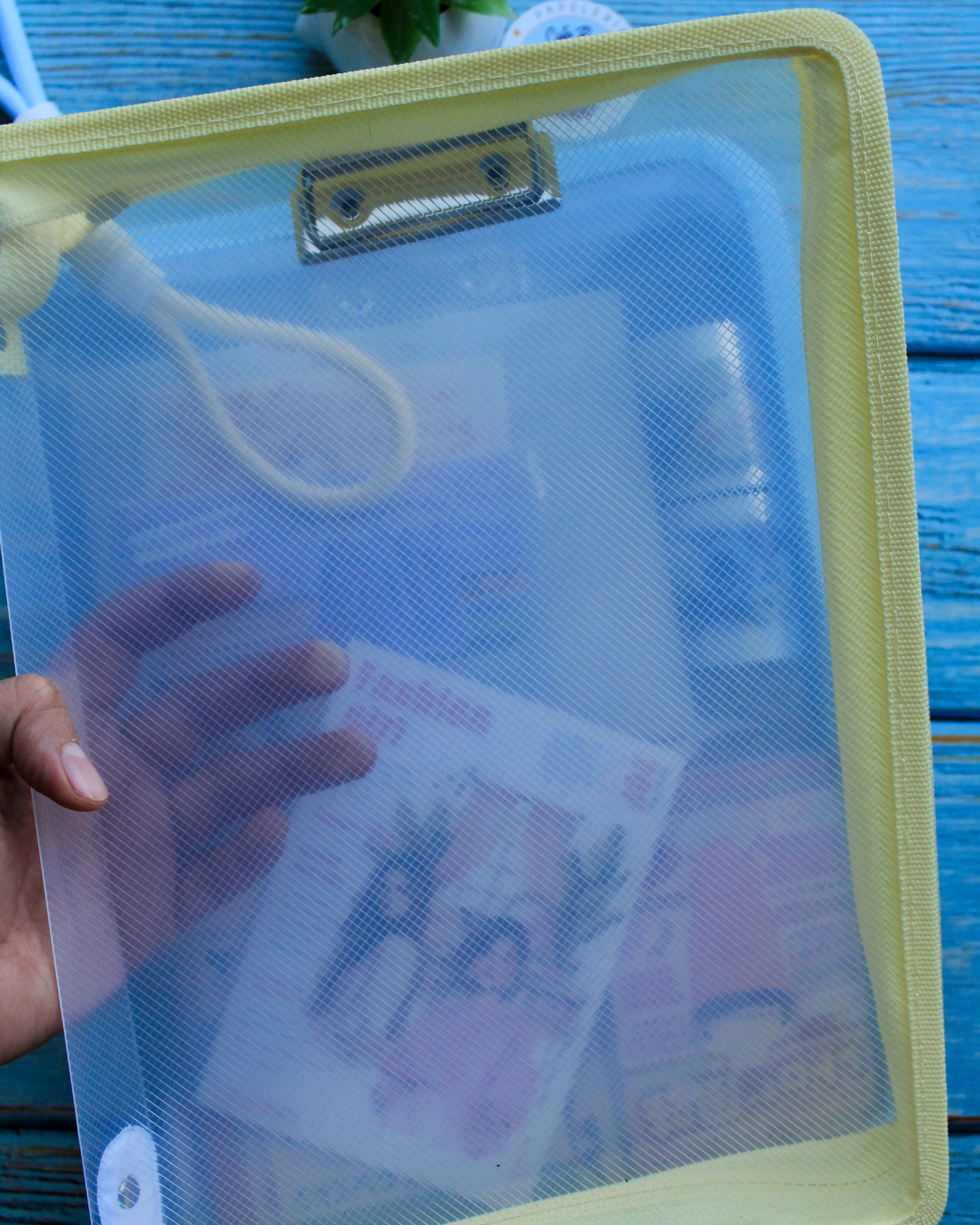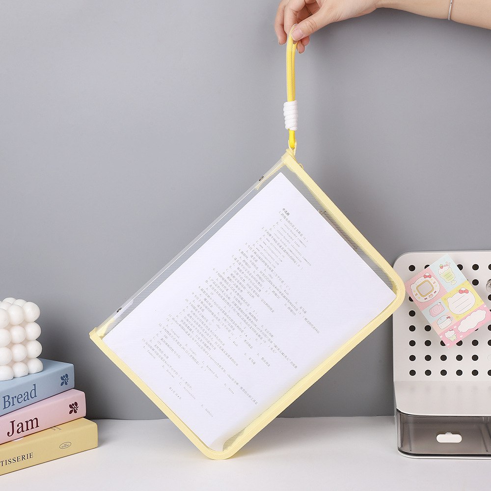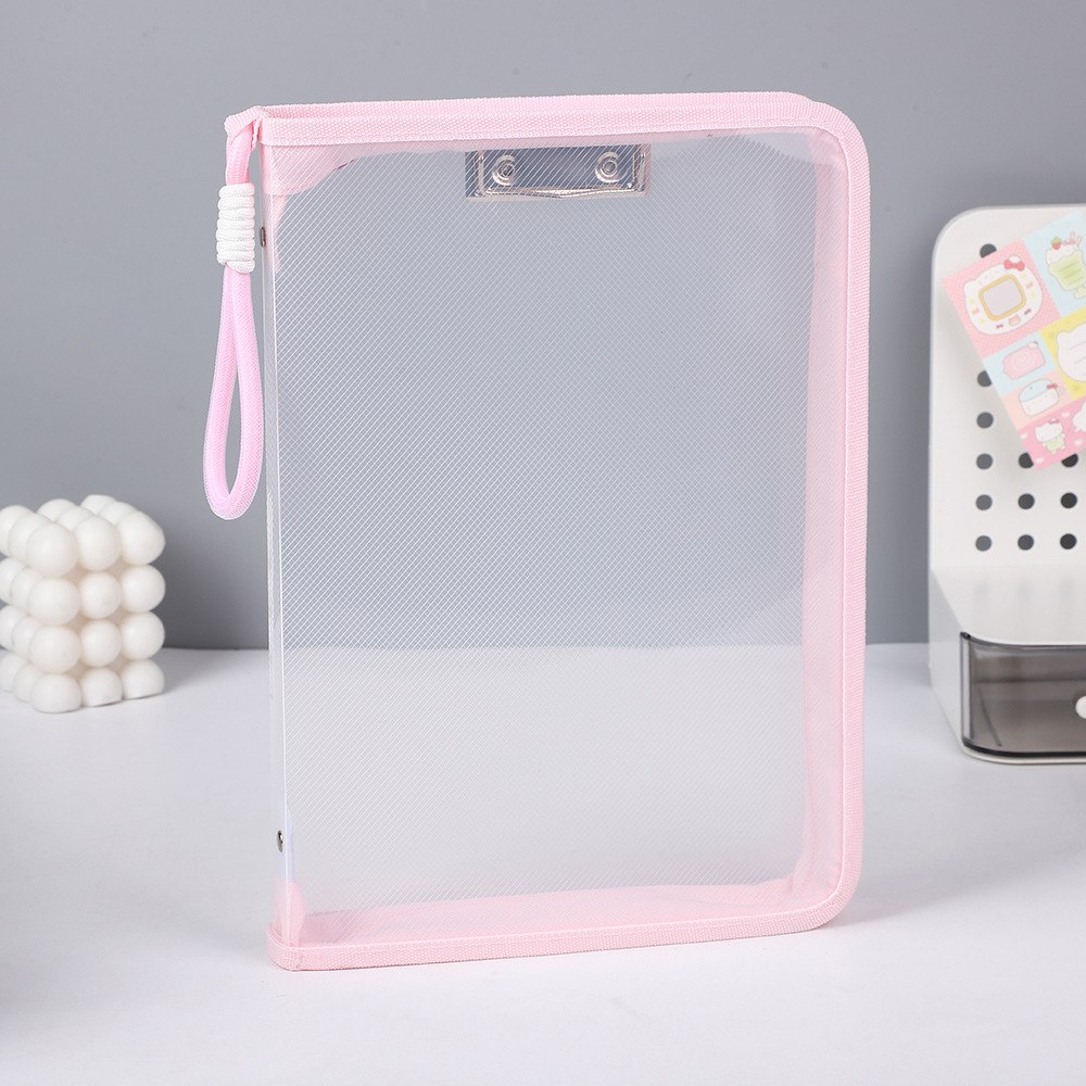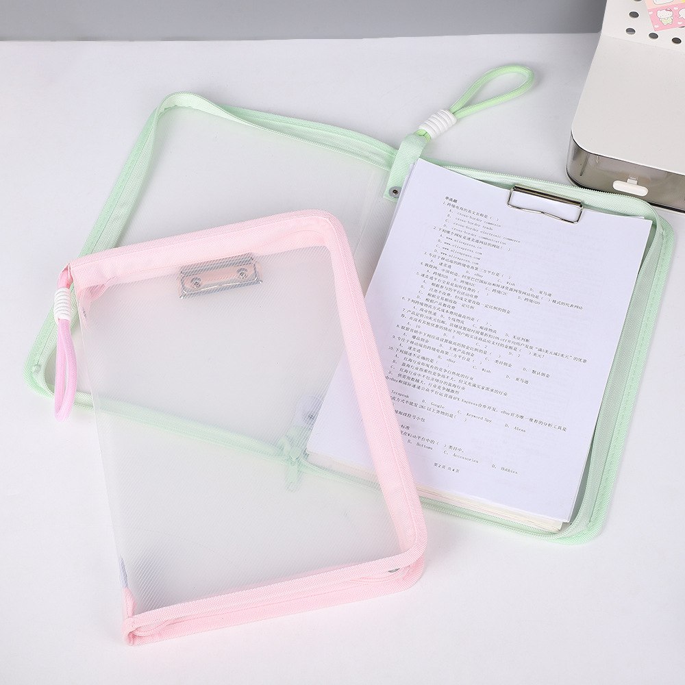 Carpeta de almacenamiento transparente en colores pastel (23 x 33 cm), diseñada para organizar y proteger tus documentos con estilo. Fabricada en material PP resistente, es ligera, flexible y cómoda para uso escolar, oficina o proyectos de scrapbooking. Incluye cierre seguro, clip apretador para sujetar hojas y una asa ergonómica para transportar fácilmente todo tu material. Mantiene boletas, tareas, cuadernos y papelería a la vista y ordenados, combinando funcionalidad y diseño diferenciado frente a carpetas convencionales.