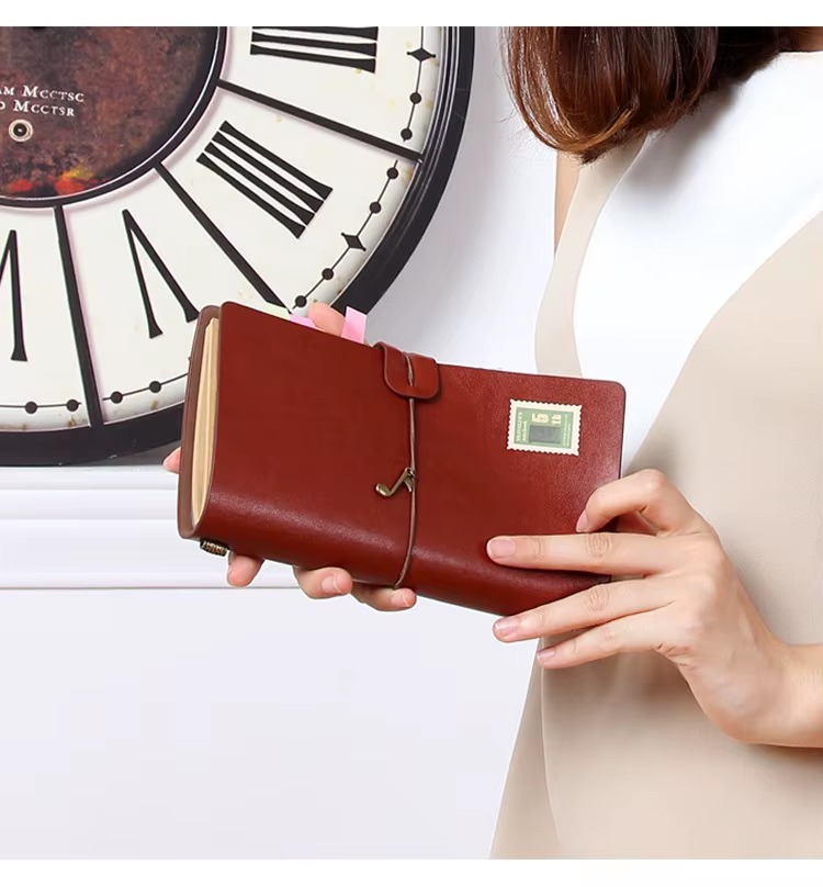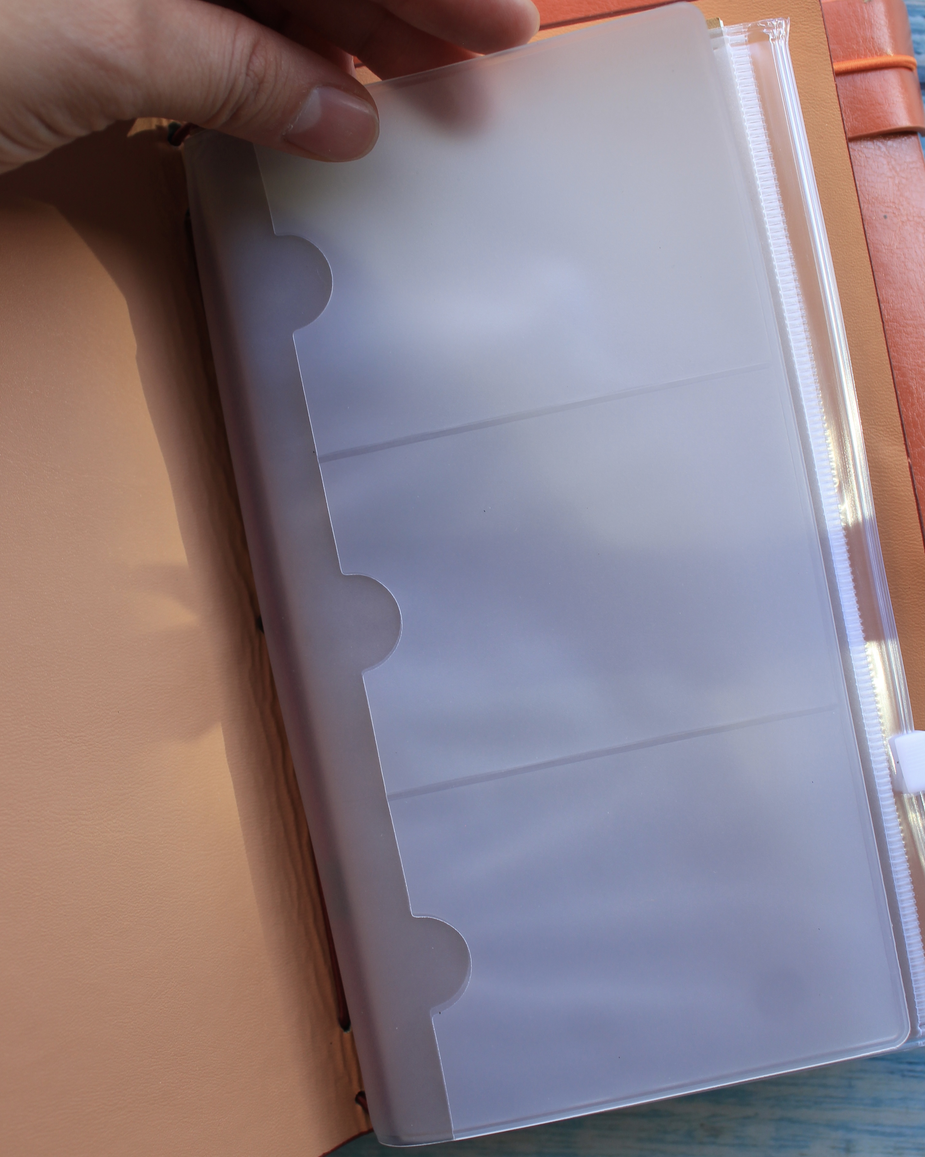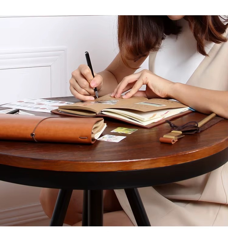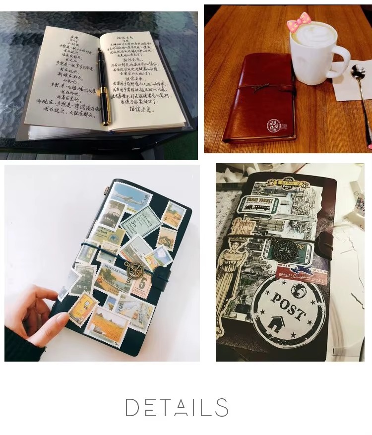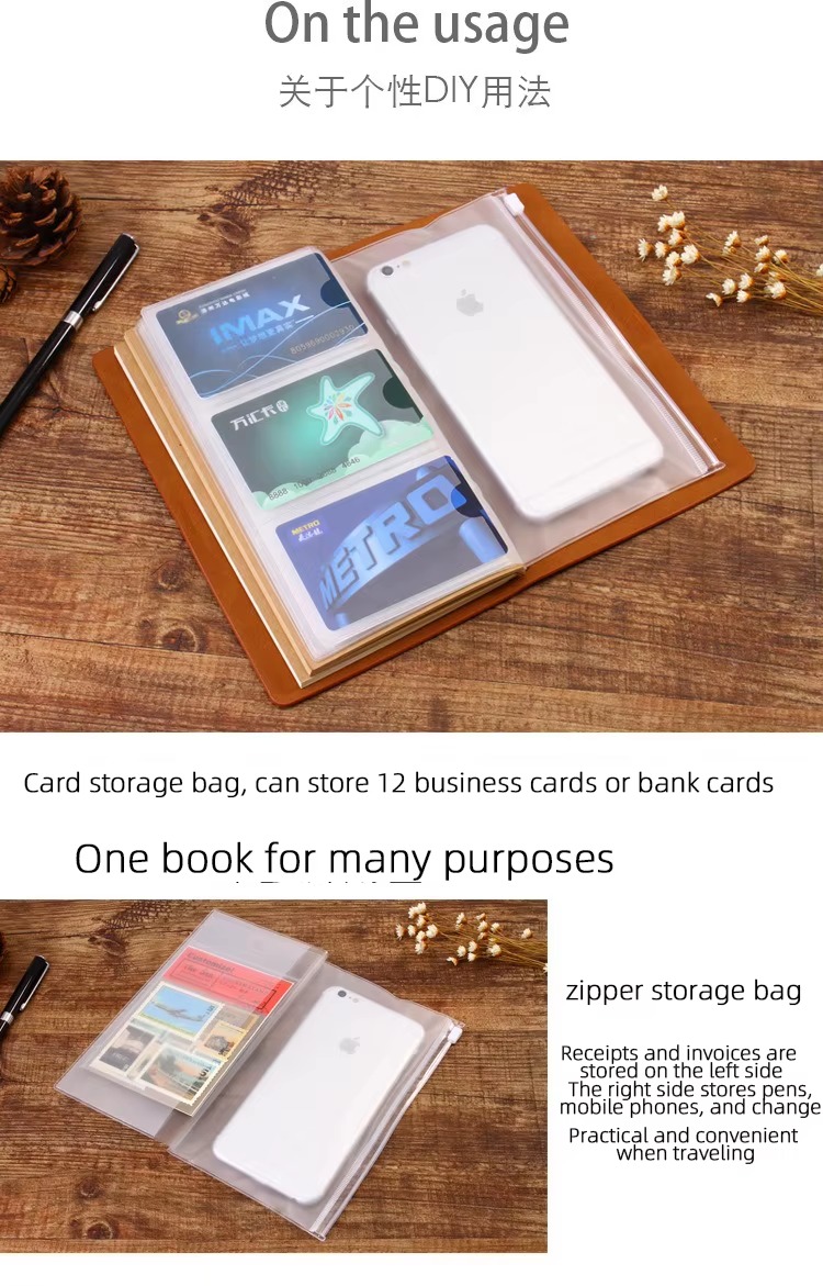 Su diseño tipo cuaderno viajero permite personalizar su interior gracias a su sistema de elásticos, que facilita cambiar o agregar libretas según tus necesidades. Además, incorpora sobres plásticos tipo PVC ideales para guardar fotos, stickers, papeles decorativos, tickets, recuerdos o documentos pequeños.