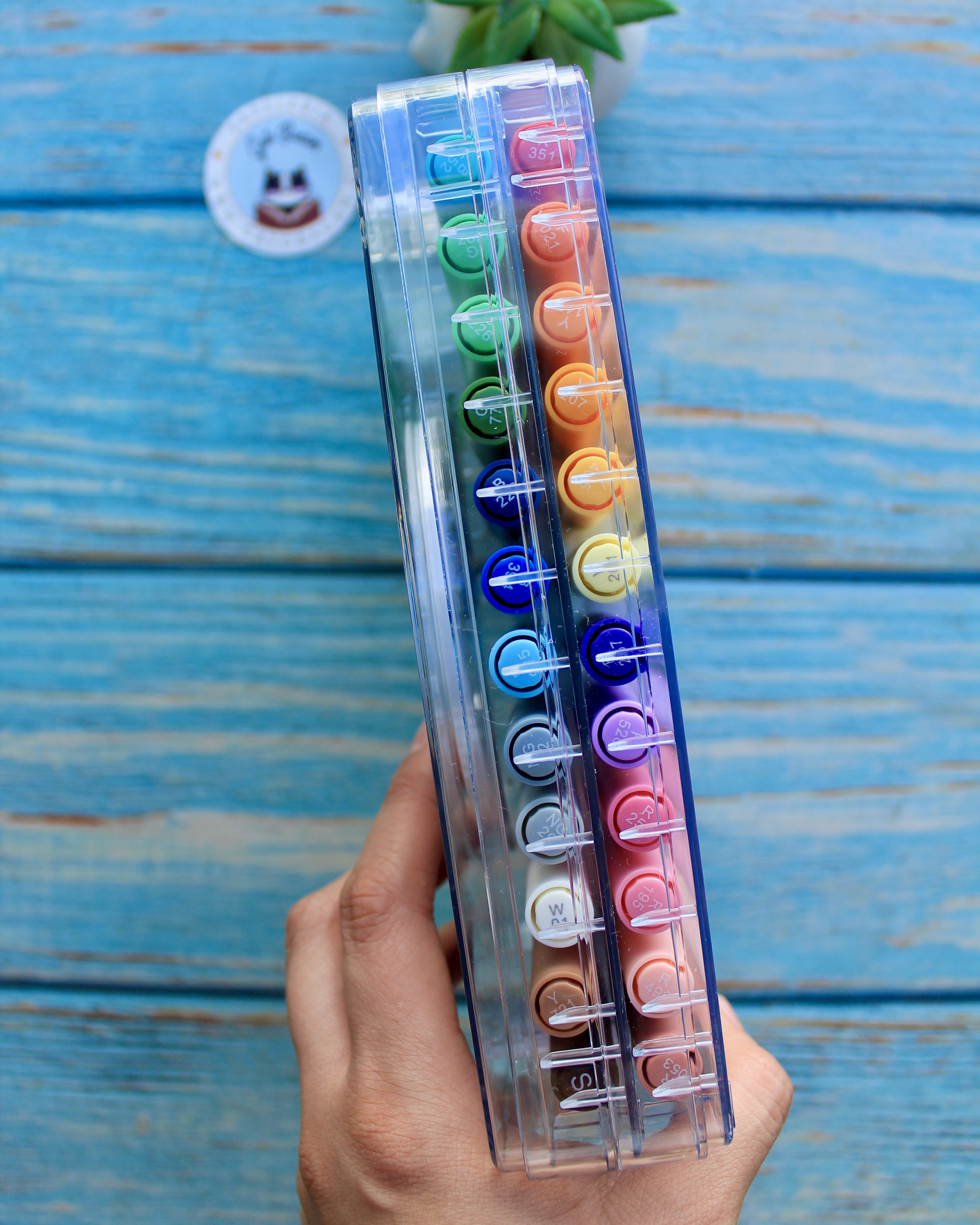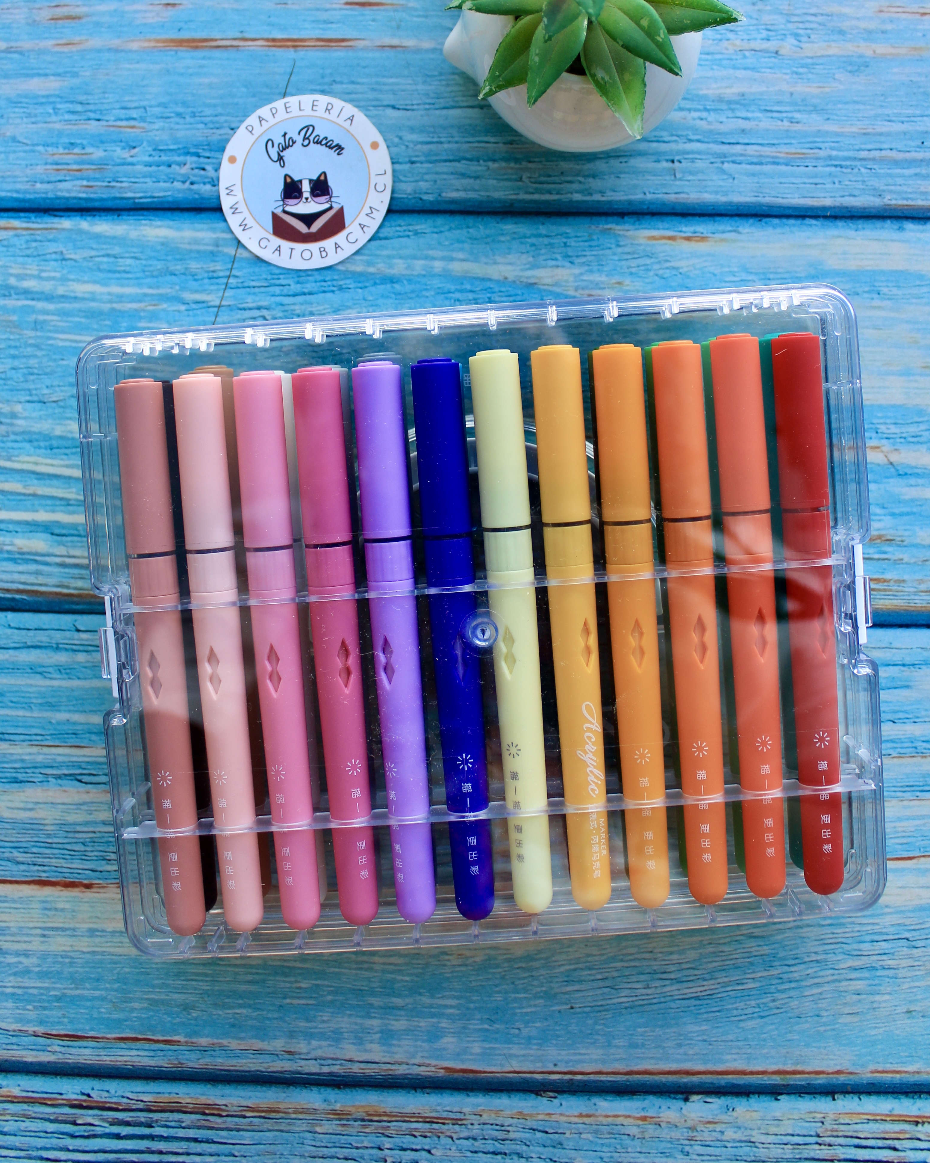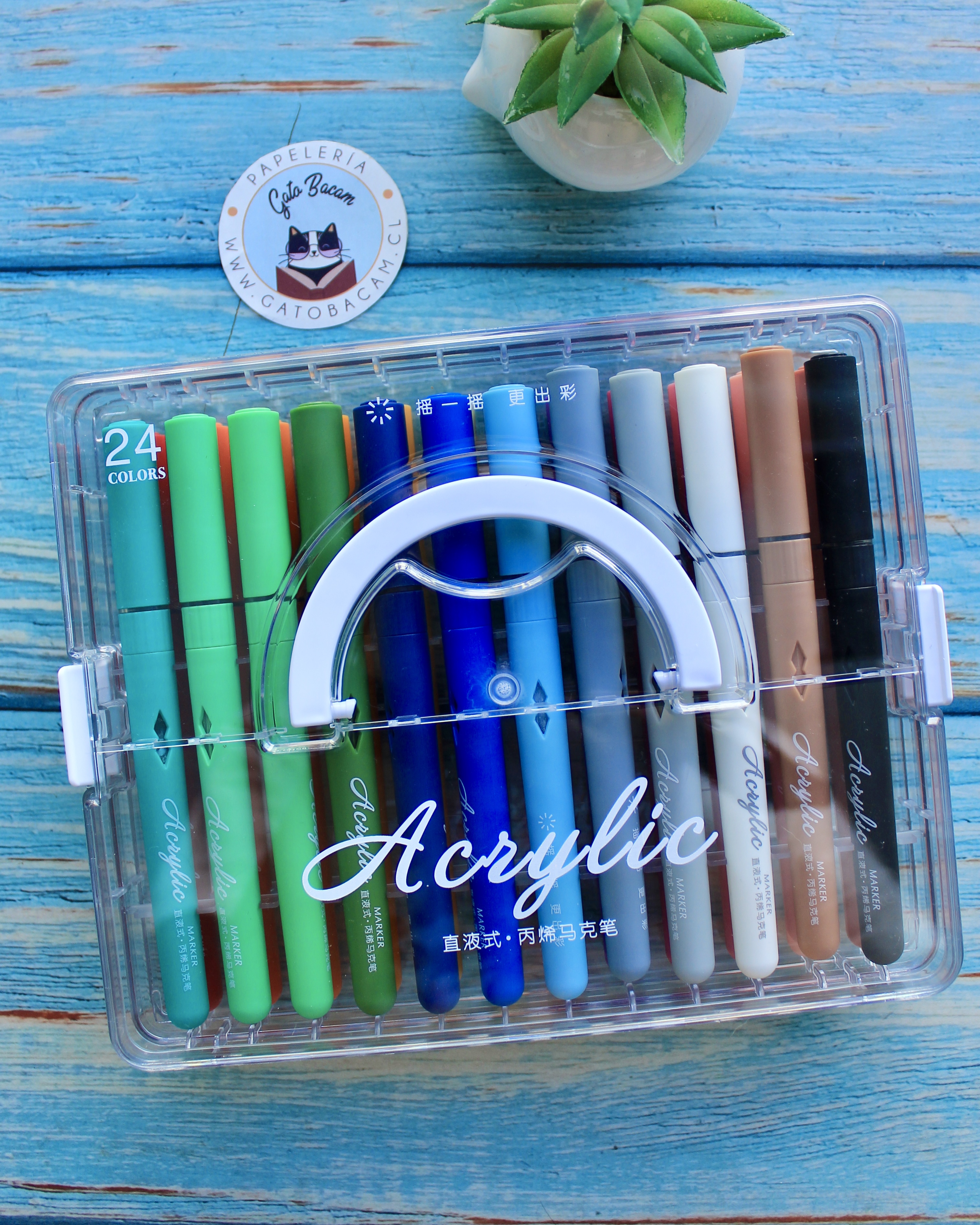 Marcadores acrílicos punta pincel — set de 24 colores. Rotuladores de tinta de alta pureza que ofrecen colores vibrantes y duraderos, permanentes e impermeables una vez secos. Su punta tipo pincel (2,4 mm) permite trazos finos y medios y facilita distintas técnicas creativas, mientras que el cuerpo ergonómico de 170 mm asegura un agarre cómodo en sesiones largas.