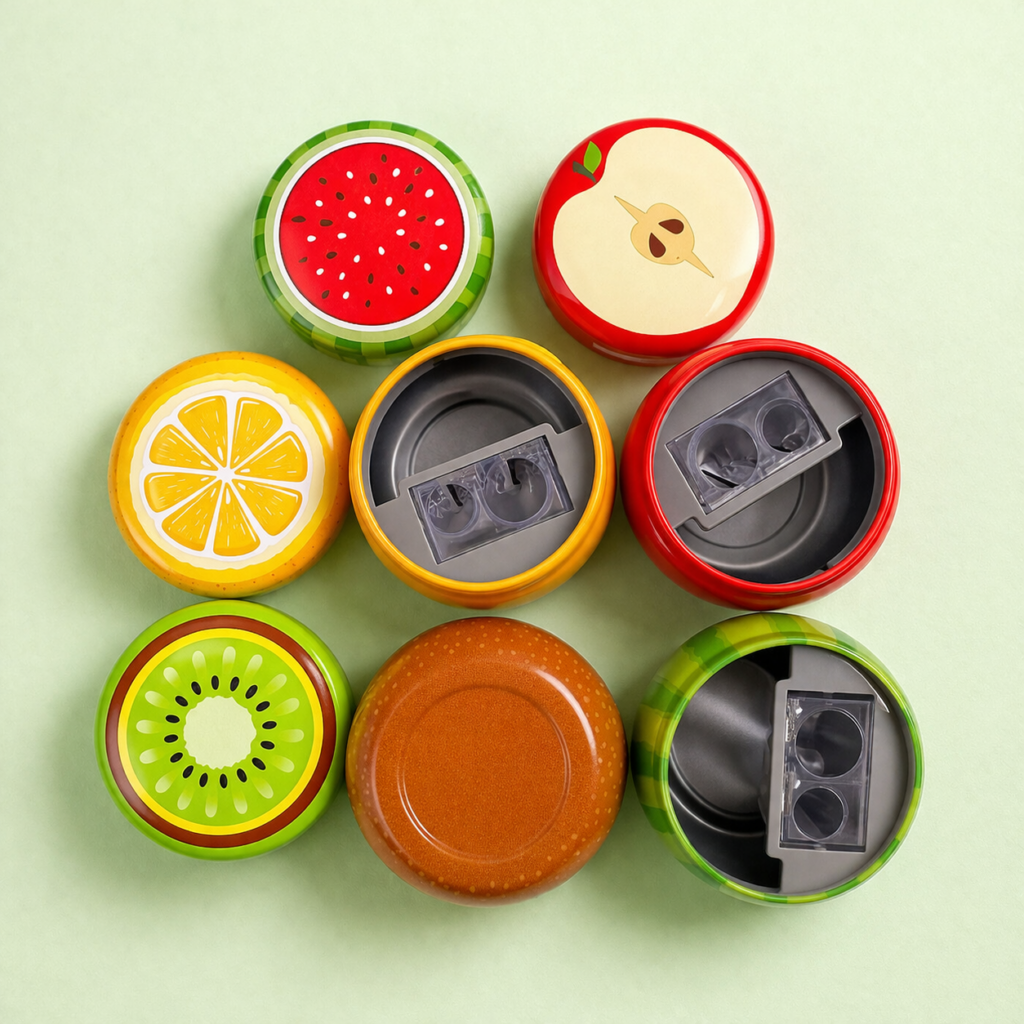 Sacapuntas con depósito diseño frutas — práctico y colorido para el escritorio o la mochila. Este sacapuntas de plástico resistente incluye un depósito integrado que recoge las virutas para mantener el estuche y la superficie de trabajo limpios y ordenados. Su tamaño compacto (5 × 5 × 3,5 cm) y su diseño ligero lo hacen fácil de transportar y usar en casa, colegio u oficina.