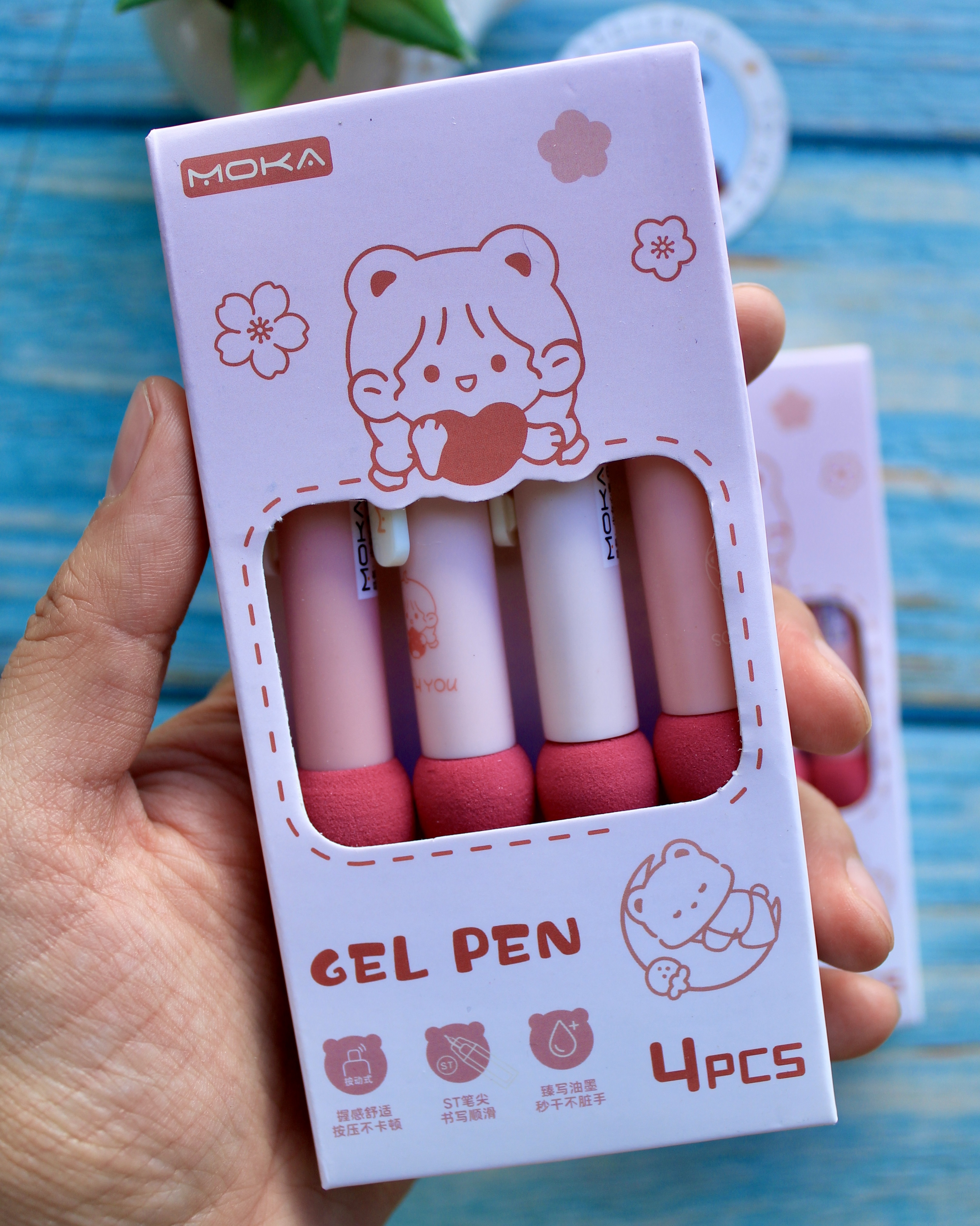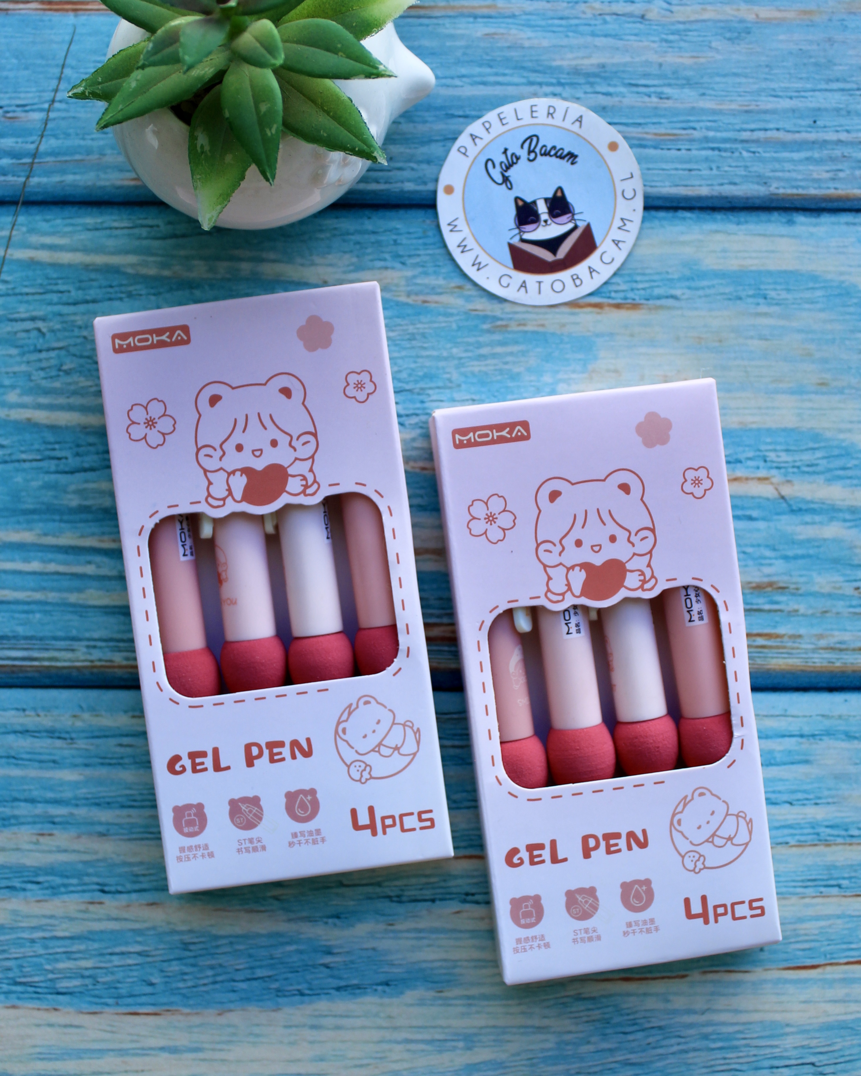 Set 4 bolígrafos tinta gel negra — Caja rosada con esponjita decorativa
