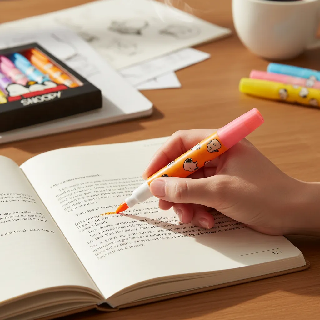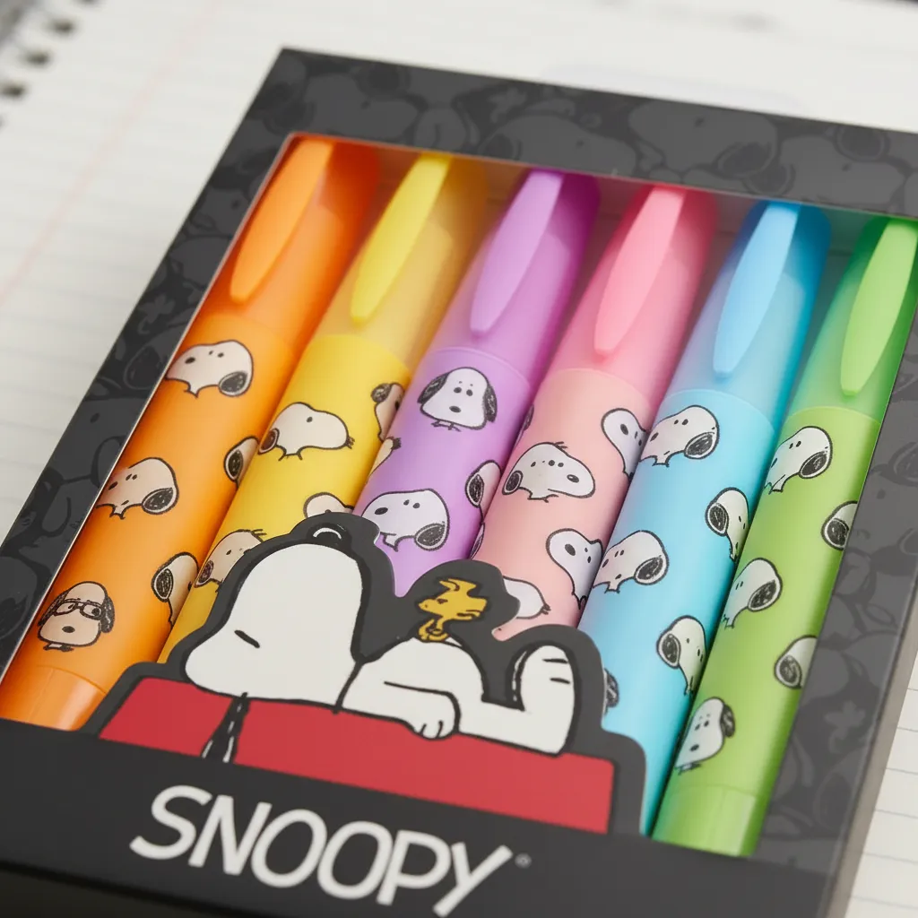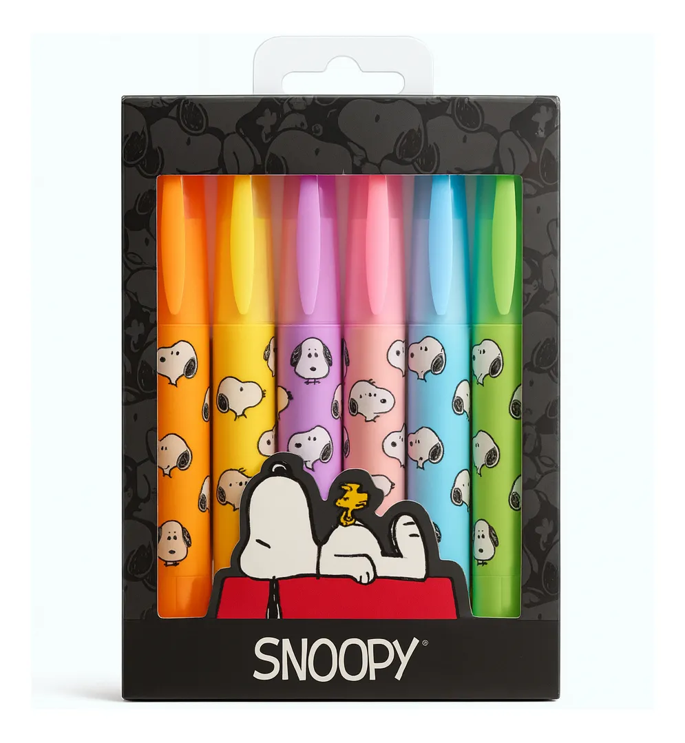 - Set de 6 marcadores resaltadores con diseño oficial de Snoopy.