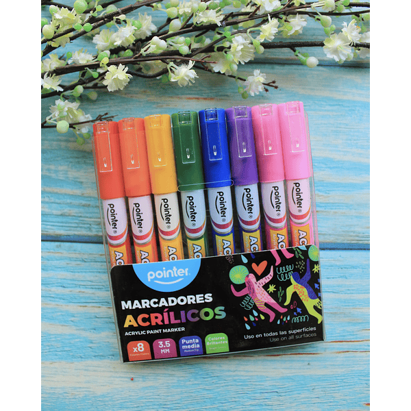 8 marcadores acrílicos punta media 3.5mm, colores brillantes, uso en todo tipo de superficies