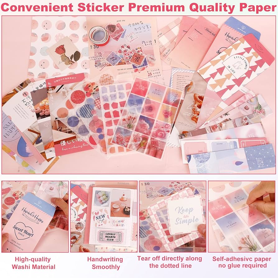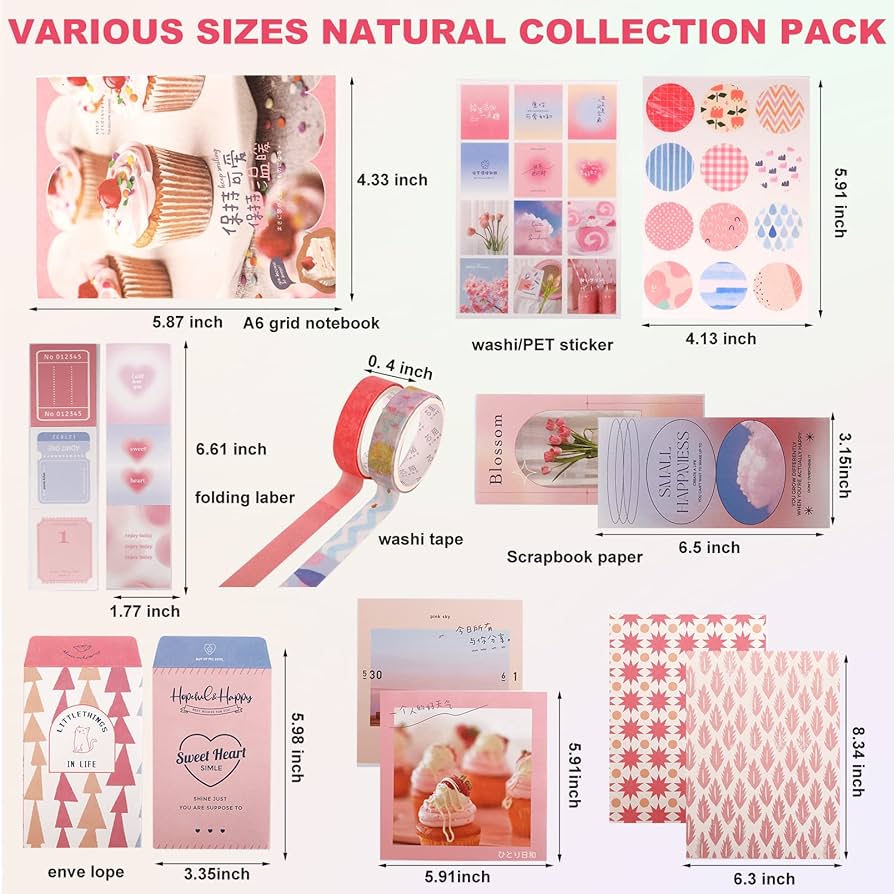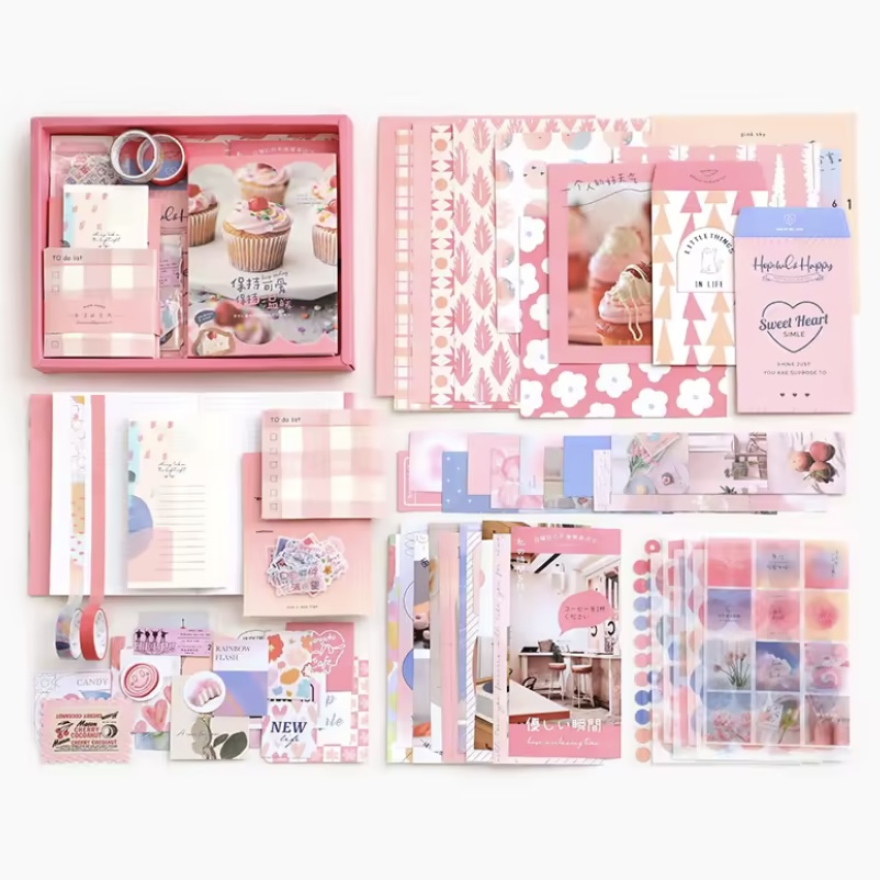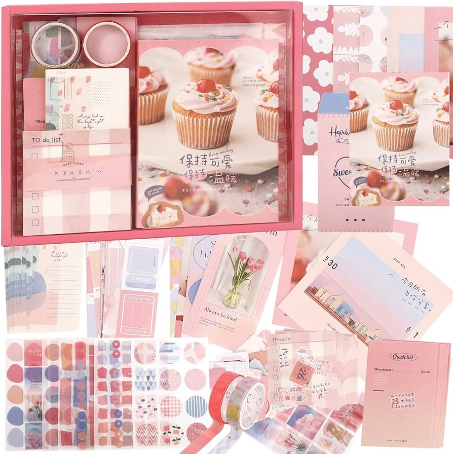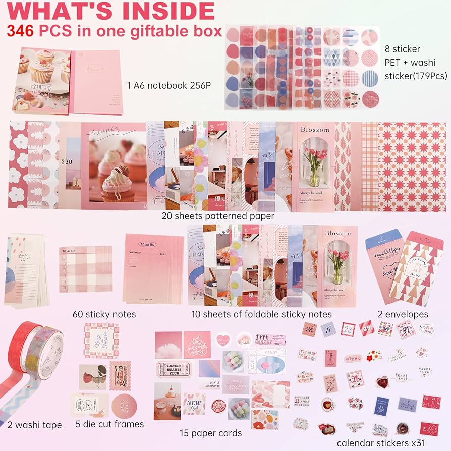 Este completo kit incluye una variedad de papeles decorativos, stickers, tarjetas, notas y accesorios cuidadosamente diseñados para que cada creación tenga un toque elegante y creativo.
